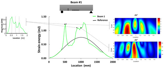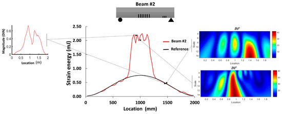 In the case of beam #1, a substantial increase in strain energy was observed at the location of a single crack within the shear zone, as well as in the regions surrounding the middle of the beam. For beam #2, there was a noticeable increase in the strain energy in the middle section; however, the shear cracks did not have a significant impact on the strain energy. Moreover, the total strain energies for the reference beam, beam #1 and beam #2 were 13.57 mJ, 19.04 mJ and 25.47 mJ, respectively. This suggests an estimated increase in damage and deformability of 40% for beam #1 and 81% for beam #2. Although this study does not delve into the intensity of damage, it indicates that beam #2 was likely more damaged than beam #1.