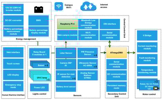 The robot has two powerful 12 V brushed DC motors with a metal gearbox, which are controlled by an Atmel Atmega2560 (Atmel Corporation, based in San Jose, California, USA) microcontroller using a high-power H-Bridge driver. The robot uses different relays to control the UV-C lamps. For the low-power mode of the robot, the UV-C lamps can be turned off with the lowest setting of one lamp on. It is also equipped with a powerful 5 W LED used to see in hallways far apart. This was proven to raise the efficiency of human detection (first of all, the human will see it and be aware), with the only limitation being battery autonomy becoming lower (up to 1 h decrease). The actuators and sensors are represented in the block diagram of Figure 3.