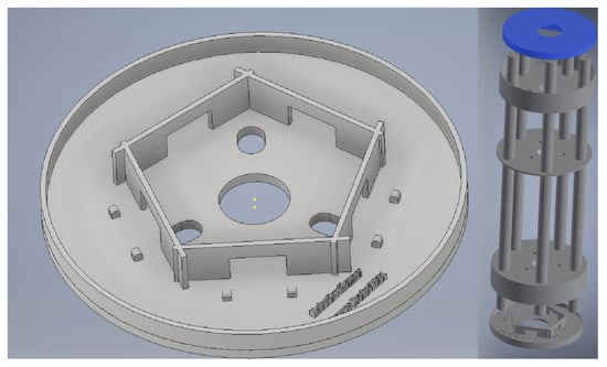 During the implementation of the project, it was necessary to design certain components for building and supporting the robot. The UV lamp holder was made using the design shown in Figure 5 in the Autodesk Inventor Professional 2019 v4 tool. Other components, such as colored washers, an ultrasonic sensor holder, a LiDAR case holder, etc., were also designed. The 3D design was chosen because there are no components already made that fully meet our requirements, and the low cost of this approach was also an important decision factor.