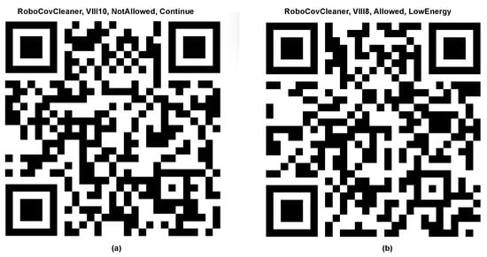 Examples of QR code which dictates what rules are to be followed: not allowed to enter a room (a), allowed to enter a room and use low-energy mode (b).