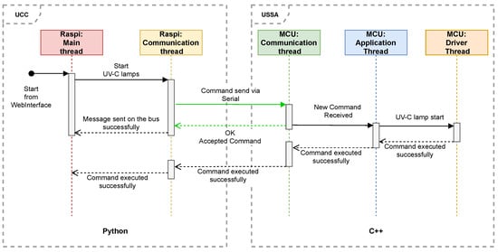 Sequence diagram between the two logical units UCC and USSA for sending a command and the related execution threads.