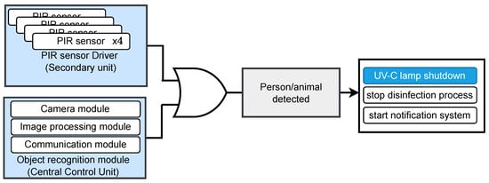The primary concept behind the usage of UV-C lamps is their ability to induce damage to the DNA of bacteria and viruses, resulting in the sanitization of targeted areas. Nucleic acids are damaged, exposed to the germicidal wavelengths of UV light, their RNA and DNA are altered, and they can no longer reproduce properly. National Emerging Infectious Diseases Laboratories (NEIDL) (NEIDL is a state-of-the-art research facility comprising significant isolation laboratories located in Boston, MA, USA) studied the efficiency of the UV-C lights on some materials that contain the SARS-CoV-2 virus. It was discovered that a dose of 5 mJ/cm2 applied for 6 s resulted in a reduction of 99% of this virus, and a dose of 22 mJ/cm2 would result in a reduction of 99.99% in 25 s. UV-C lamps destroy viruses, bacteria, fungi, etc., but they also harm humans. For this reason, the robot was equipped with two systems for detecting people, which will be discussed in more detail in the next sections (Section 3.2).