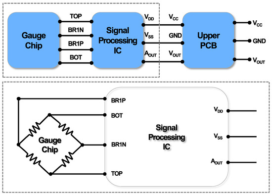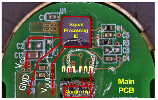 Through a teardown analysis of the sensor, a functional analysis was conducted. The Wheatstone bridge-type gauge chip senses input hydrogen pressure as a resistance change, which is then transmitted to the signal processing IC as an input signal as shown in Figure 4. The output value (AOUT) processed through the IC is transmitted as the VOUT signal to external pins via a spring. Power is also connected to the pins. In Figure 5, the optical microscope results for the main PCB indicate the functional connection of each component.