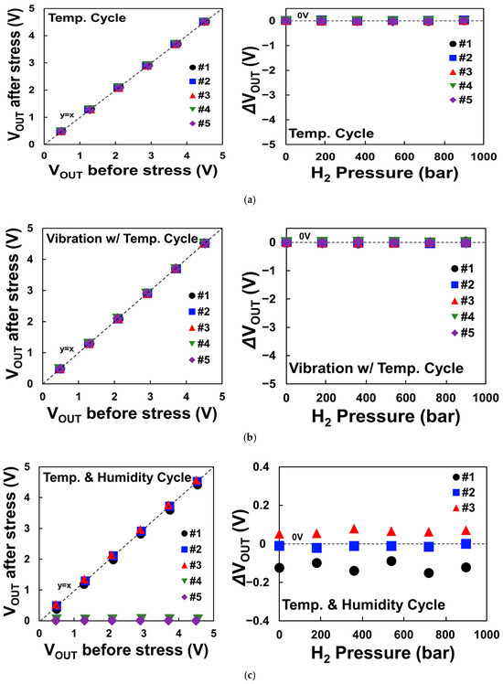 Comparison of output voltage before and after stress due to (a) temperature cycling, (b) vibration with temperature cycling, and (c) temperature and humidity cycling. ΔVOUT is the result of subtracting VOUT before stress from VOUT after stress.