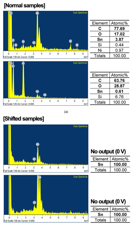 In the case of normal samples, the predominant constituents of the conformal coating, such as carbon and oxygen, were detected at levels exceeding 80%. Conversely, these elements were absent or present in significantly lower quantities in the samples with no output and the shifted samples, respectively. In particular, it is confirmed that in the samples where no output values (0 V) were observed, Sn, a metallic component within the PCB substrate, accounted for 100% of the composition. This absence of conformal coating leads to severe malfunction. However, the shifted samples show approximately 50% of the conformal coating components. This analysis indicates that uneven coating is a major factor contributing to the primary defects, resulting in output voltage fluctuation.