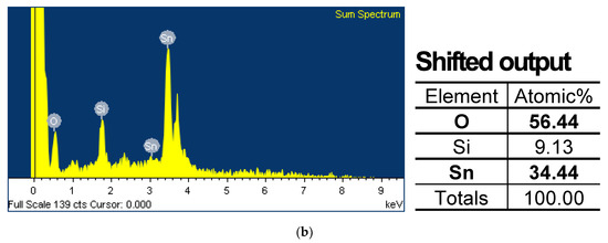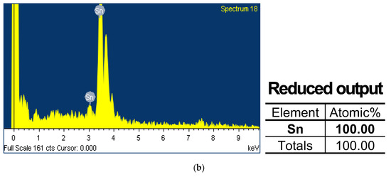 The analysis of the failure samples from system-level evaluation indicates both output degradation as well as increase as shown in Figure 9. The results are aligned with our reliability results from the temperature and humidity cycling test which also demonstrated output voltage fluctuations. This indicates that the reliability test effectively represents a potential reproduction of failures arising from vulnerabilities in the sensor. Figure 10a depicts the observation of the main PCB of a system-level failure sample using an optical microscope, revealing discoloration and corrosion. This corresponds to the outcomes seen in the shifted samples resulting from temperature and humidity cycling. Furthermore, the EDS analysis result shown in Figure 10b also confirms the presence of 100% (Sn) composition, indicating the absence of a conformal coating. These observations suggest a correlation between the absence of conformal coating and the occurrence of system-level failures.