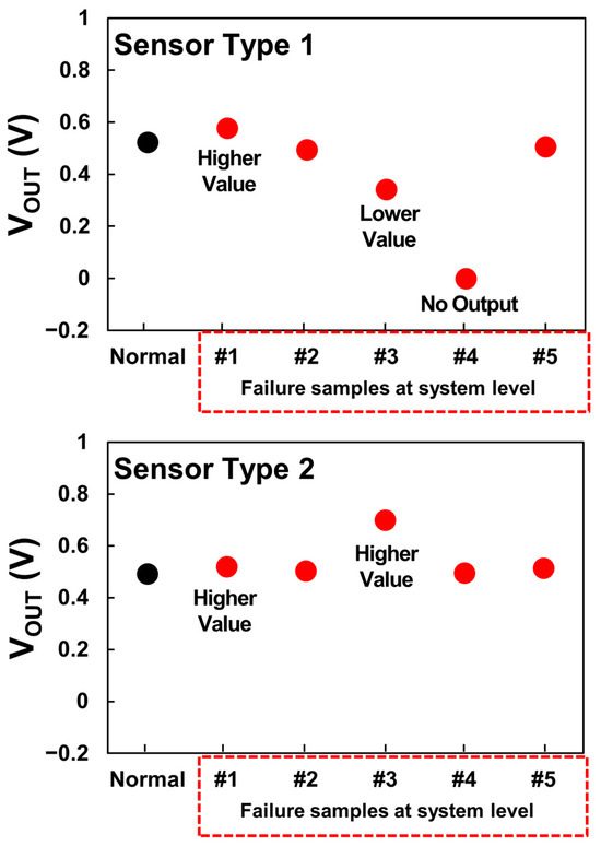 Output voltage characteristics for each failure sample occurring at the system level (including cases of both higher and lower values compared to normal output).