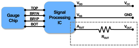 Consequently, we provided a simple and easy model to explain the voltage fluctuation. After the temperature and humidity cycling test, the discolored and corroded resistor was positioned between AOUT as the output of signal processing IC and VOUT and roles as EMC protection and voltage leveling as shown in Figure 11. Once the resistance is exposed to humidity along with its surroundings, extrinsic resistances can be generated due to factors such as ion migration and corrosion [16]. As shown in Figure 11, this extrinsic resistance can be created either in series or in parallel with the resistor. Serial resistance leads to a decrease in output voltage, while parallel resistance results in an increase in output voltage. When serial and parallel resistances are randomly generated, they render the output unpredictable which depends on the amount of both serial and parallel resistance generated for each. This relationship can be expressed using the following simple equation: