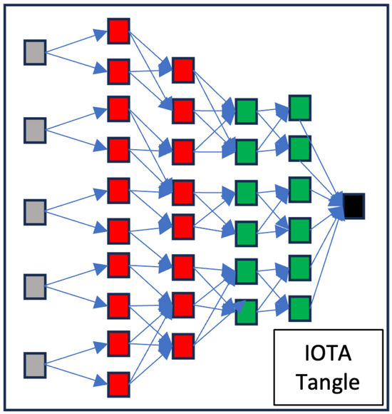 IOTA’s Tangle, a creation of the IOTA Foundation, has been recognized as a potential solution to address the limitations of traditional blockchain technology [6]. Unlike a standard blockchain, the Tangle does not consist of blocks or chains but is based on a Directed Acyclic Graph (DAG)—a structure of vertices connected by unidirectional edges that do not form loops—as shown in Figure 1. As the figure depicts, black represents the genesis; green indicates confirmed transactions; red signifies uncertain transactions (about their full acceptance); and grey denotes tips (transactions still needing validation). This design is essential for IOTA’s decentralized, distributed, immutable, and shareable digital ledger, which stores transactions efficiently. The primary goal of IOTA is to cater to the immense volume of transactions occurring within the extensive network of interconnected IoT devices, necessitating a scalable ledger system [23]. In the Tangle, each peer contributes to the network’s consistency by validating and approving two previous transactions before initiating a new one, eliminating the need for transaction fees and facilitating faster acceptance of new transactions.
