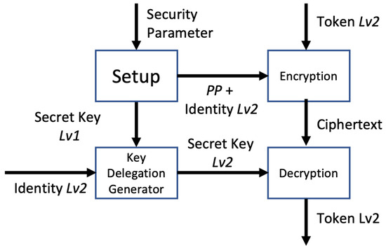 Figure 3 explains the HIBE scheme on . The difference between and the other levels lies in the key delegation process. uses the , whereas the other levels use the .