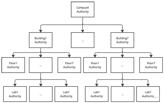 For example, as shown in Figure 4, the campus authority, serving as the central authority for the hierarchy, initiates the setup process and the policies. The CA also produces the from its and the identity of Building1, and then gives the secret key to the building authority, acting as the domain authority (DA), and entities within the Building1 domain, for example, the staff on Floor1. The building authority generates an access rights delegation process, which creates the for Floor1. Following this, the floor authority undertakes a similar delegation process, creating the for Lab1. This sequential secret key generation process continues through each hierarchical level, reaching the lowest tier, Lab1.