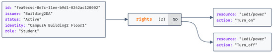 In our proposed hierarchical access control framework tailored for IoT settings, we adopt a structure similar to the one presented in [6] for token generation. However, our methodology diverges by bifurcating policies into two distinct elements: identities and roles. For instance, as illustrated in our token structure diagram (see Figure 5), a token may be designated for the identity CampusA, Building2, Floor1. Such specificity ensures that only a DR with this identity can decrypt and effectively utilize the token (see Figure 6). Each token encapsulates several vital components, including a unique identifier, an address, the corresponding policy, and particular access privileges (e.g., adjusting lighting levels). The meticulous design of these tokens not only bolsters security by guaranteeing a precise alignment of access rights with identities but also simplifies access control management in intricate IoT ecosystems.