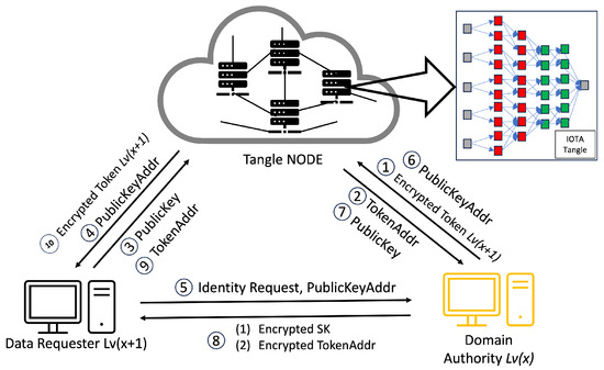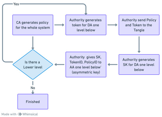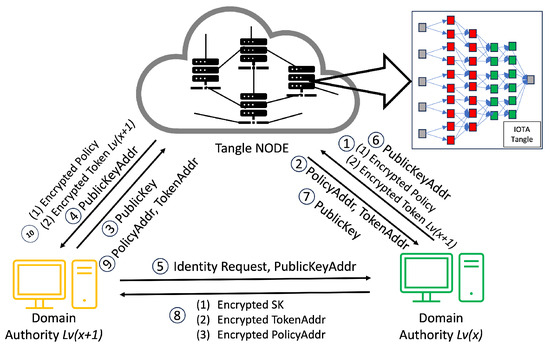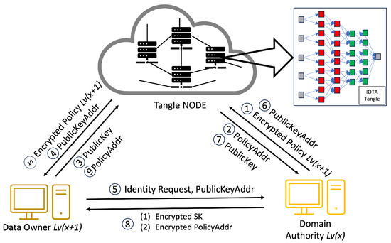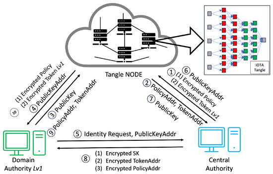 - Central Authority (CA): The CA is trusted by the whole system. The CA is responsible for registering domain authority level 1, generating the , , and , giving to level 1, generating a whole policy for the system, and storing them in the Tangle.