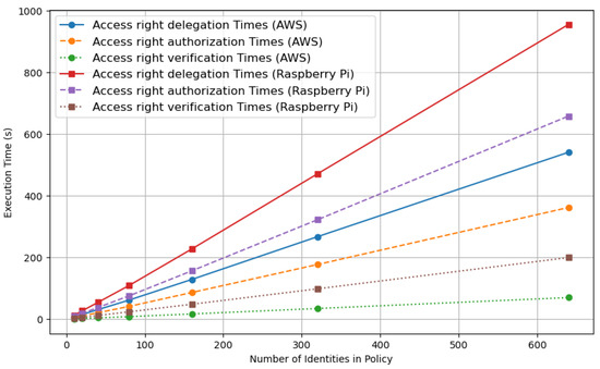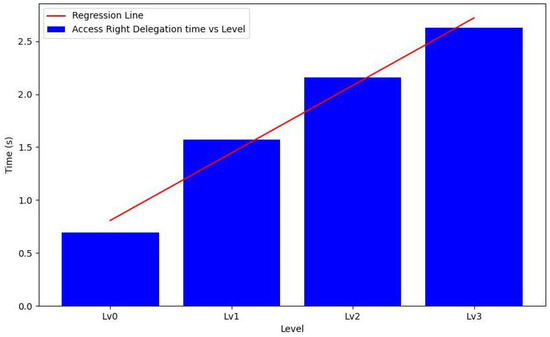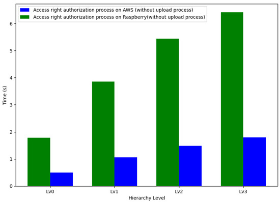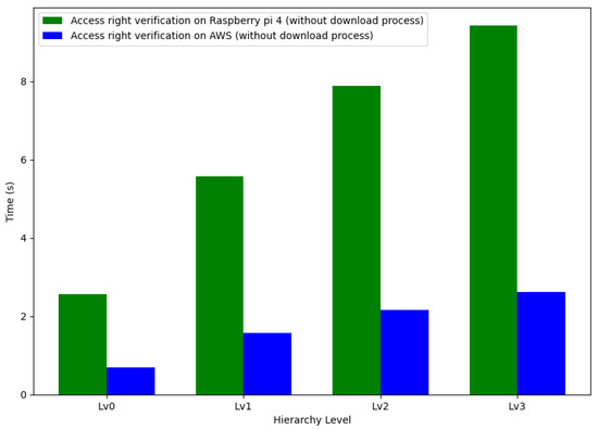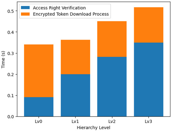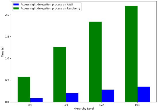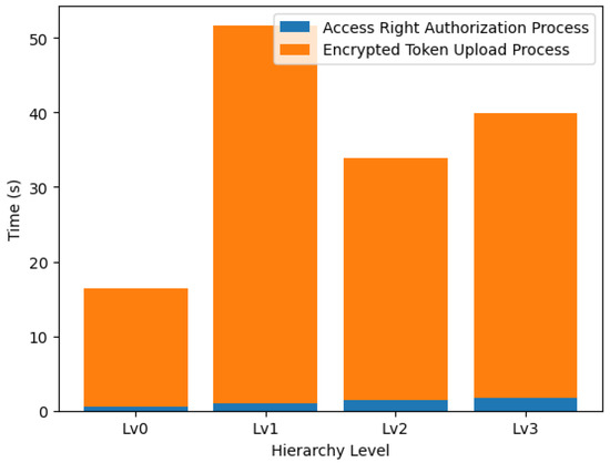In conclusion, our scheme exhibits longer operational times for setup, access right delegation, and access right authorization processes; compared to the ZNSK scheme, the actual time is smaller (in the order of tenths of a second) than the average tangle upload time (34.26 s) for all levels shown in Figure 18. Our scheme and ZNSK scheme require communication with the tangle in this amount of time. Moreover, our system is specifically tailored to meet the requirements of hierarchical organizations in an IoT environment, adding relevance to our findings. Future work should focus on optimizing the more time-intensive aspects of our scheme, mainly aiming to reduce setup, delegation, and authorization times to enhance its overall efficiency.