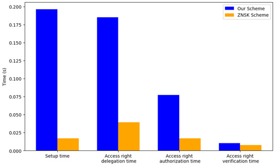 As illustrated in Figure 25, our scheme displayed a marked difference in operational times compared to the ZNSK scheme. The percentage differences in the operational times for the setup time, access rights delegation, access rights authorization, and access rights verification were 1048%, 369.72%, 355.57%, and 33.35%, respectively. Despite these high percentages, it is crucial to note that the absolute differences in the operational times were relatively small, being in the order of tenths of a second. Specifically, for the setup time, the variance was approximately 0.179 s; for access rights delegation, it was around 0.146 s; for access rights authorization, it was 0.061 s; and for access rights verification, it was nearly 0.0026 s. While notable in percentage terms, these minor variances are still well within the delay tolerance thresholds outlined in [28], suggesting comparable performance levels.