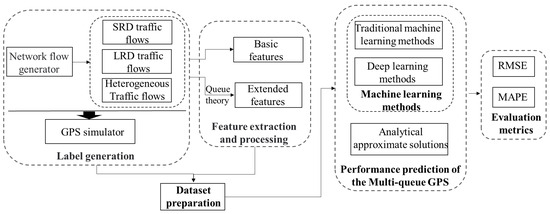 Many researchers have focused on the performance prediction of the multi-queue GPS scheduling mechanism. Existing methods mainly predict the performance metrics using analytical methods and deep learning-based methods. For example, in [9,10], the authors employed large deviation principles-based (LDPs) analytical methods to derive the total queue length distribution for the overall GPS scheduling. In [11], the authors used empty buffer approximate (EBA)-based analytical methods to derive the queue length distribution of each application service. In addition, to obtain accurate performance metrics, Zhang et al. [12] tried to predict the performance of the GPS scheduling mechanism by employing a deep learning-based method, where the queue theory and the attention network are combined. Although there has been much work on the performance prediction for the GPS scheduling mechanism, limitations remain. Specifically, for the simplicity of performance prediction, a particular traffic model (e.g., short-range dependent (SRD) or long-range dependent (LRD)) has often been considered in existing methods. The traffic arriving from different application requests in the real IoT environment is heterogeneous, and only considering a particular traffic model will lead to the deviation of the GPS performance prediction. In addition, there is no unified benchmark in the open literature for fairly comparing existing methods.