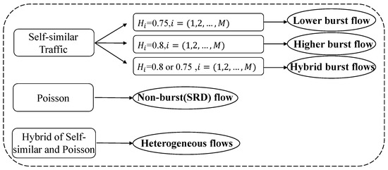 - Dataset Higher burst flow: Each flow obeys the self-similar process, and the Hurst parameter of each flow is set as ;