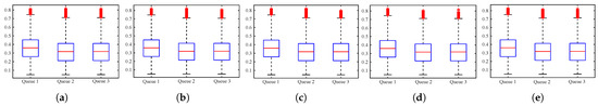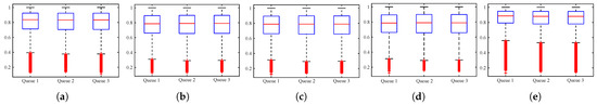 The distribution of the dataset: To make the setup of the platform transparent and prove the effectiveness and applicability of the dataset selection, the distribution of these five datasets is mainly introduced in the following. The data distribution of these five datasets is shown in Figure 3, Figure 4 and Figure 5. Without a loss of generality, three-queue GPS has been mainly considered. Figure 3 shows the server utilization distribution of each flow on the five datasets, where the server utilization is calculated according to the guaranteed service capacity of each flow, that is, . Figure 3 shows that in each dataset, the distribution of the server utilization of the three network flows has similarity, including upper bound, lower bound, median, upper quartile, and lower quartile. There are great differences among the datasets.