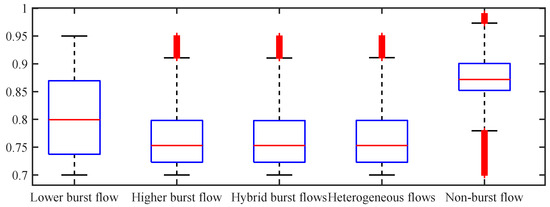 Figure 5 shows the distribution of the overall server utilization, where the overall server utilization is the server-based service capacity, which is . As shown in Figure 5, the server utilization of the selected dataset is consistent with the characteristics of network flows. For example, due to the burstiness of self-similar network flows, the server utilization of self-similar network flows was smaller than that of non-burst flows as a whole.