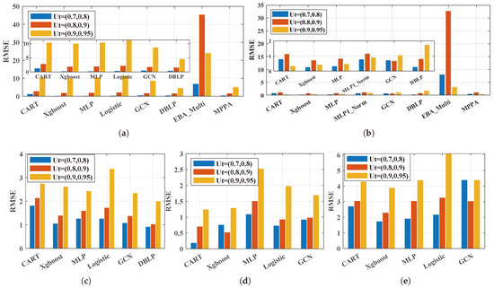 Observation 2:Deep learning methods may fail to work compared to the traditional machine learning methods for multi-queue GPS’s performance prediction. As can be seen in Figure 6d,e and Figure 7d,e, for dataset Heterogeneous flows and dataset Non-burst flow, the traditional machine learning methods CART and Xbboost showed lower RMSE and MAPE values than the deep learning methods under most utility rages. Specifically, Xbboost always had the best performance in terms of the RMSE on dataset Non-burst flow under the three utility ranges. For the MAPE, Xbboost also had a great performance. While for dataset Heterogeneous flows, CART performed better on both the RMSE and MAPE under most scenarios. Similar findings can also be noticed on the datasets Lower burst flow, Higher burst flow, and Hybrid burst flows when the DLPE was not taken into consideration.