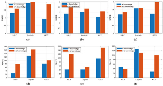 Observation 3:Knowledge-driven information does not work under the Hybrid burst flows. Figure 8 compares the deep learning methods with the basic features as the input features and the deep learning methods considering the knowledge-driven features. MLP, Logistic, and the GCN were taken into consideration here. It can be noticed that for the RMSE, the methods considering the knowledge-driven features all performed better than the methods without knowledge-driven features. In addition, the methods considering the knowledge-driven features showed better performance than the methods without knowledge-driven features in most scenarios. For the dataset Hybrid burst flows, the MAPE of the MLP considering the knowledge-driven features performances was not so good. The reason can be easily explained. The knowledge-driven information is extracted from the queue theory on the GPS subject to the self-similar traffic with the same Hurst parameter. In contrast, the Hurst parameters in dataset Hybrid burst flows are different for each flow. Thus, the knowledge-driven information may not be so correct where noise may be introduced into the model, thereby resulting in training bias.