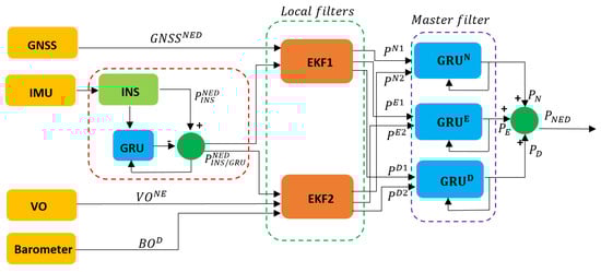 - Negru, S.A.; Geragersian, P.; Petrunin, I.; Zolotas, A.; Grech, R. GNSS/INS/VO fusion using Gated Recurrent Unit in GNSS denied environments. In Proceedings of the AIAA Science and Technology Forum and Exposition, AIAA SciTech Forum 2023, National Harbor, MD, USA, 23–27 January 2023. [Google Scholar] [CrossRef]