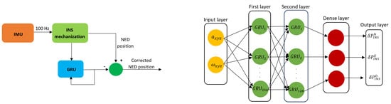 - Geragersian, P.; Petrunin, I.; Guo, W.; Grech, R. An INS/GNSS fusion architecture in GNSS denied environments using gated recurrent units. In Proceedings of the AIAA Science and Technology Forum and Exposition, AIAA SciTech Forum 2022, San Diego, CA, USA, 3–7 January 2022. [Google Scholar] [CrossRef]