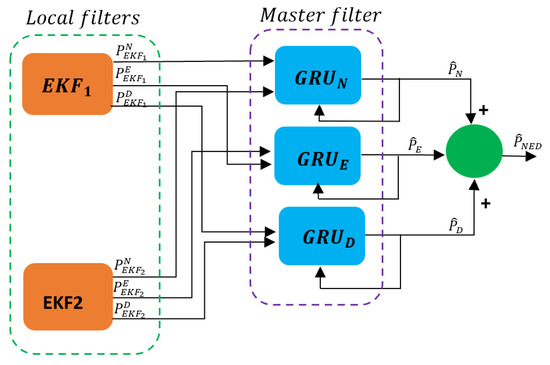 - The research introduces, in a three-dimensional scenario, a hybrid fusion architecture that integrates GRU (gated recurrent unit) and EKF (extended Kalman filter) systems. This study offers a detailed comparison of the new hybrid approach against the traditional FF (federated fusion) architecture.