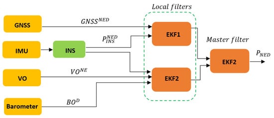 - Lawrence, P.J.; Berarducci, M.P. Comparison of Federated and Centralized Kalman Filters with Fault Detection Considerations. In Proceedings of the 1994 IEEE Position, Location and Navigation Symposium—PLANS’94, Las Vegas, NV, USA, 11–15 April 1994; pp. 703–710. [Google Scholar] [CrossRef]