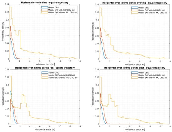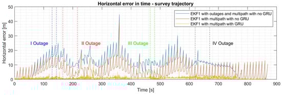 - Based on the performance metrics presented in Table 2 and Table 3 for a square trajectory and Table 4 and Table 5 for a survey trajectory, it is evident that the corrections offered by the master GRU model surpass those of the master EKF filter. The master GRU model demonstrates the capability to achieve a sub-meter positioning error in terms of horizontal and vertical error for the square trajectory and below 2 m for the survey trajectory, under different weather and light conditions.