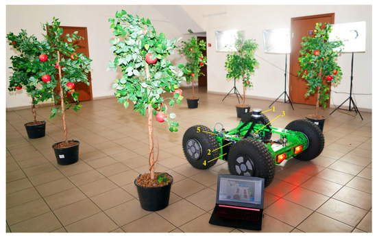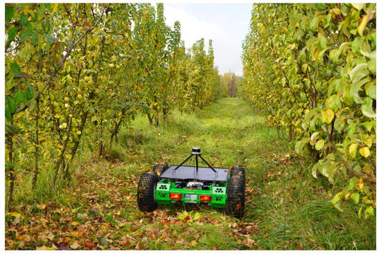 When determining the location and route of movement of an autonomous vehicle in an industrial garden, two types of methods for obtaining information can be used: passive (from global satellite systems (GLONASS/GPS), radio transmitters) and active (using its own sensors, laser rangefinders, stereo cameras, inertial navigation systems, etc.) [8,9,10,11]. Various types of sensors are used to detect trees, fruits, leaves, weeds and other obstacles in garden rows. Like methods of obtaining information, sensors can be passive or active. In industrial gardens, various types of cameras are used to determine the locations of autonomous vehicles: mono- and stereo cameras that determine the distance to the harvested fruit or weed, RGB cameras (which determine the color and shape of the fruit or leaves, as well as signs of their diseases, in 2D format with high resolution), thermal imaging and hyperspectral cameras [12,13]. Cameras are classified as passive sensors.