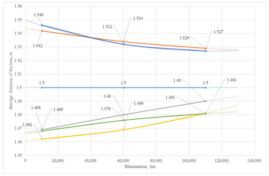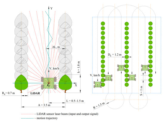 An analysis of the operating parameters of the LiDAR sensor showed that it provides a high degree of positioning accuracy under various lighting conditions at different speeds in the aisles of an artificial horticulture model 3 m wide with an inter-stem distance of 1.5 m and a tree crown width of 0.5 m. The use of existing modern sensors with an optical rangefinder with a resolution of 4.5 million pixels, a frame rate of 25 FPS and the ability to automatically adapt to the level of illumination in combination with stereo cameras and GPS/GLONASS navigation will further improve the accuracy and ensure the autonomous performance of the units of the main technological operations in intensive horticulture with a deviation from a given trajectory of no more than 1.5–2 cm, which satisfies the agrotechnical requirements.