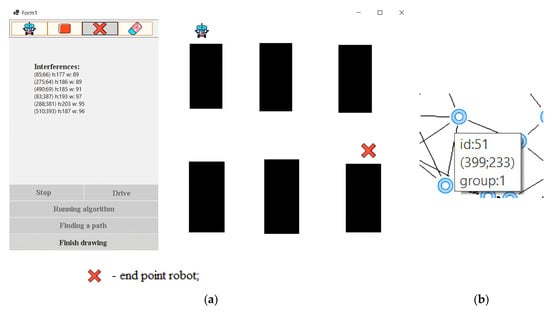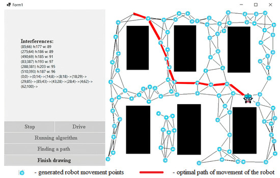 When the program [50] starts, the user is presented with an image that shows exactly where the interference is. Next, the user needs to draw a map, namely, the starting position of the robot, its end point and the obstacles. To perform this, the user clicks the Draw button. After clicking, a window is displayed (Figure 7). If the user has already drawn a map and wants to move on to the learning phase, they need to click the Finish Drawing button. Because the robot has not yet found the optimal path, it is more expedient for the user to press the “Search path” button. After that, 100 points will be generated, which will be connected to each other using the k-nearest-neighbor method. When the user hovers over a specific node, a window will appear that will display basic information about it (Figure 8).