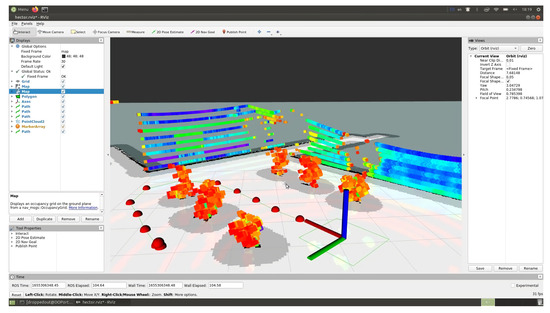 The route of a self-driving vehicle in an artificial garden was built using Rviz 1.14.20-1 software by specifying individual trajectory points on a map built using a LiDAR sensor. In Figure 10, the autonomous vehicle is marked with a green rectangular outline, with obstacles and the “danger zone” around it (detected using the LiDAR sensor) shown as a gray area. Experiments indoors with artificial trees were carried out three times, resulting in the determination of the maximum and minimum deviations from the given distance between the vehicle and the trajectory points (tree trunks).