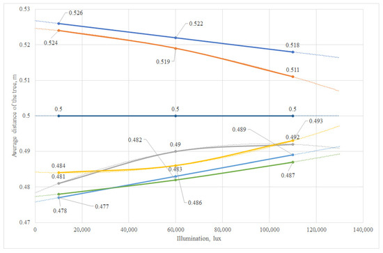 An analysis of the deviation in the real path of an autonomous vehicle from the specified initial, intermediate and final trajectory points, set at a distance of 0.5–1.5 m, was carried out. The illumination level varied from 10 to 110 thousand lux in increments of 50 thousand. The equipment for conducting the experiment under laboratory conditions is given in Table 2.