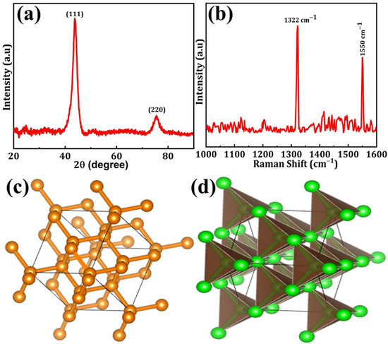 The XRD spectra of DNPs are depicted in Figure 1a. The XRD pattern exhibits a dominant peak positioned at 43.6° and a secondary peak positioned at 75.5°, representing the crystal planes (111) and (220) of DNPs, respectively [19]. Figure 1b displays the Raman spectra of DNPs. The sharp and intense peak observed in the corrected spectra, obtained by plotting the Raman intensity from 1000 to 1650 cm−1, corresponds to the first-order DNPs peak located at approximately 1332 cm−1. This peak corresponds to the vibrational mode involving the stretching and compression of the carbon-carbon (C–C) bonds in the DNPs lattice. Furthermore, the emergence of the G-band peak at approximately 1550 cm−1 can be observed, indicating the presence of in-plane stretching of sp2 bonds within the graphite-like substances [20]. The possible ball-stick and polyhedron structures of DNPs are shown in Figure 1c,d.