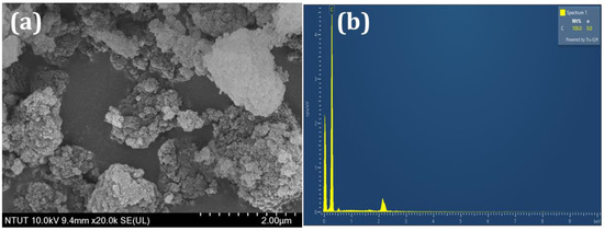 SEM analysis was utilized to investigate the surface morphology of the DNPs. By utilizing typical SEM micrographs, Figure 2a presents the visual aspect of the DNPs, revealing their agglomerated particle-like structure. The presence of carbon was confirmed by the EDX spectrum shown in Figure 2b. The SEM results confirmed the presence of a DNPs structure, as indicated by the obtained results.