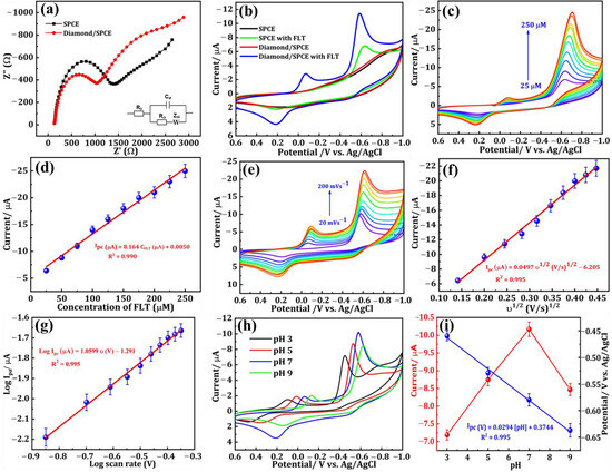 (a) EIS spectra of SPCE (Black dots) and DNPs-modified SPCE (Red dots) in 0.05 M [Fe (CN)6]3−/4− containing 0.1 M KCl (Inset: Randles equivalent circuit). (b) CV response of SPCE (with and without FLT), and DNPs/SPCE in 75 µM of FLT containing 0.1 M PBS (pH = 7.0). (c) CV responses with increasing FLT concentration (25 to 200 µM). (d) Ipc vs. square root of the scan rate. (e) CV curves for scan rates (20 to 200 mVs−1) in 75 µM FLT (0.1 M, pH 7.0). (f) Ipc vs. square root of scan rate and (g) Log Ipc vs. log v. (h) CV curves of FLT (75 µM) at diverse pH (3, 5, 7, and 9). (i) values of Ipc and Ep versus pH.