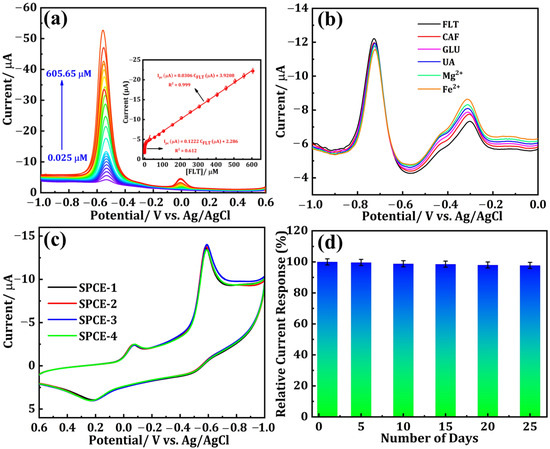 (a) DPV responses for the various concentrations of FLT from 0.025 to 605.65 μM using the DNPs-modified SPCE (Inset: the calibration plot between the peak current vs. FLT concentration). (b) DPV curves for the DNPs/SPCE in the presence of FLT and FLT with various interfering substances. (c) Reproducibility and (d) storage stability.