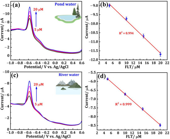 DPV response of (a) pond water and (c) river water samples containing FLT at different concentrations. (b,d) Corresponding linear plots.