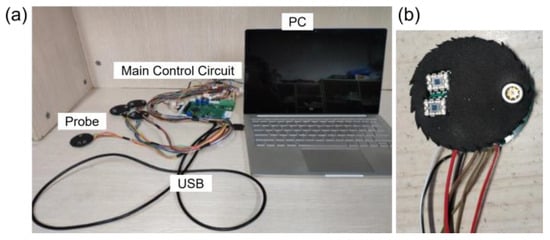 A custom NIRS device used to demonstrate the complete crosstalk test program. (a) A photograph of the light probe. (b) A photograph of the test equipment.