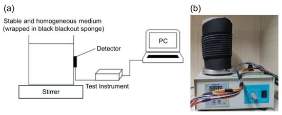 Figure 3 shows the diagram and scene photograph of the ink drop test. The experimental procedure was as follows: First, the first probe of the test device was wrapped with a black light-blocking sponge around a polyethylene container with 600 mL of fresh water, ensuring that the highest point of the probe was below the surface of the water. The temperature of the magnetic stirrer was set to a constant 31 °C. The container was placed on the magnetic stirrer tray and the stirring rotor was placed inside the vessel. Then, the materials used in the experiment were prepared: 600 mL of water was added to the small beaker, followed by 1 mL of carbon ink injected into the beaker using a sterile syringe. It was stirred well using a glass rod to obtain a 600-fold diluted solution of black ink because the gradual change of the collected data could not be observed if the concentration of the absorbent dripped into the water was too high. Finally, the device was connected to a computer, the control page of the host computer was opened, and the software parameters such as the serial frequency were set. The device was then turned on and 1 mL of diluted carbon ink was injected with a syringe into the polyethylene container at 1-min intervals. During the whole process of the experiment, the working magnetic stirrer drove the magnetic stirring rotor in the polyethylene container to perform a high-speed rotation and stirring of the liquid so that the drops of diluted carbon ink were fully dispersed in the water; the whole process should be as gentle as possible to avoid the liquid fluctuations causing large fluctuations in the detection data. The computer display of the data curve changes was observed until the end of the experiment. The whole experimental process lasted about ten minutes in total. The variation curves of light intensity at different wavelengths for the first channel of the test instrument and the graph of the liner result of the ink drop test were then plotted.