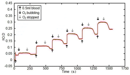 As shown in Figure 5, during the first 20 s of the experiment, the ΔO.D value remained near the baseline. After each drop of 0.5 mL of human blood, the ΔO.D value increased rapidly until it remained stable after oxygen was pumped in. However, the ΔO.D value rapidly decreased to a certain extent after the pumping of oxygen was stopped. Each cycle followed the above rules. The ability of the ΔO.D value to maintain good stability during both the baseline period and oxygen pumping indicates the reliability of the test equipment. After dripping 0.5 mL of human blood and stopping the oxygen pumping, the ΔO.D value showed a significant sudden increase and decrease, indicating that the sensitivity of the test equipment was good. For any equipment used for testing, if the test results can remain stable when the ratio of oxyhemoglobin and deoxygenated hemoglobin remains consistent, it means that the stability of the equipment is reliable. If the detection results change correspondingly and rapidly when the ratio of oxyhemoglobin and deoxygenated hemoglobin increases or decreases, it means that the sensitivity of the equipment is good.
