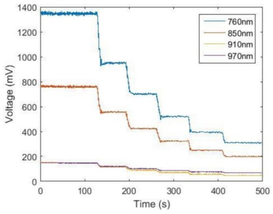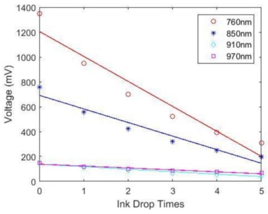 As shown in Figure 6, the light intensity at the four wavelengths of 760 nm, 850 nm, 910 nm and 970 nm detected by the photosensitive detector decreases in steps according to the same trend of change, and the time point of each change is the moment when the diluted ink is dripped into the container. This shows that the test instrument can reflect the change of absorbent concentration with good sensitivity. If the signals of these four wavelengths between two drops of ink are kept relatively smooth, it indicates that the test instrument has good stability. Broadly speaking, the results of the ink drop experiment show that the more relatively smooth the signals of different wavelengths between the two drops of ink can remain, the better the stability of the test instrument. The Beer–Lambert law indicates that the level of light intensity attenuation is proportional to the concentration of the light-absorbing substance in the solution, since there is a large change in the light intensity signal at the instant the ink is dropped before it stabilizes with stirring. In this paper, the light intensity at each wavelength, when the data are stabilized after each drop of ink, is selected and plotted. As shown in Figure 7, the light intensity detected by the test instrument and the number of drops of ink in the solution under test show a linear relationship, indicating that the test instrument has good linearity, which means it is reliable. The linear relationship between the light intensity detected by the instrument and the number of ink drops in the solution being tested is the same for any instrument. This linear relationship can indicate that the instrument has good linearity and that it is reliable.