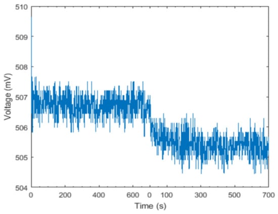 A plot of crosstalk at 760 nm is shown in Figure 10. The first 600 s of the graph is the light intensity detected by the detector when the 760 nm near-infrared light is always lit. The second 700 s is the light intensity of 760 nm near-infrared light detected by the detector when the microcontroller lights up according to the time-lighting mode of near-infrared light in the normal operation of the test instrument.