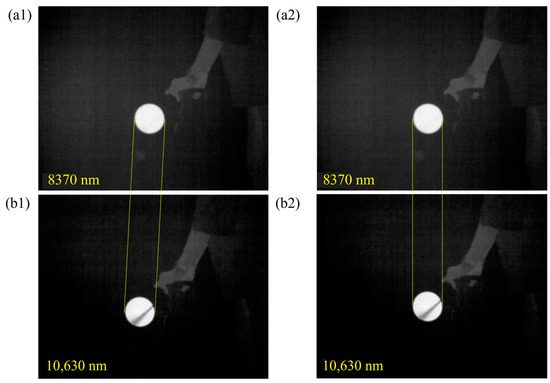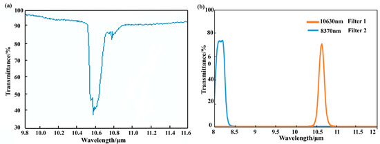 The central wavelength of the first filter corresponds to the absorption resonant peak of SF6 gas. However, the image captured also contains background noise and system noise. As a result, the second filter is used to record all these noises. One aspect to note is that, in order to avoid the interference by other gases, the central wavelength of this second filter should keep away from the absorption resonant peaks of all those gases, especially those in the covered infrared band from 8000 nm to 12,000 nm. We installed multiple bandpass filters in front of the infrared cameras for a contrast comparison, ensuring that these filters conform to the above selection condition for the second filter. Ultimately, 8370 nm was determined as the central wavelength. Meanwhile, analyzing the data from the HITRAN database [25], the infrared spectral transmittance of SF6 gas is shown in Figure 3a, which reveals a prominent absorption peak at the wavelength of 10,630 nm. Hence, we selected 10,630 nm as the central wavelength for the first filter. The spectral transmittance curves of the two customized filters are depicted in Figure 3b.