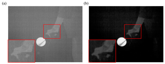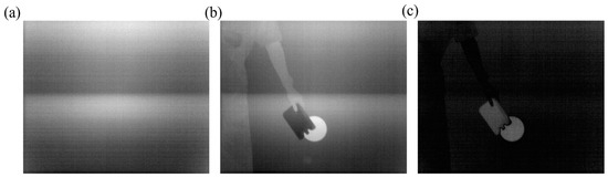 Firstly, the system noise was reduced based on Equation (1). We approximated the temperature of the ice to 0 °C. Then, we placed a piece of ice close to the camera and obtained the pixel values for the dark current DNdark. Subsequently, we removed the ice and acquired the pixel values for the target DNtarget. The images of the dark current and the target are shown in Figure 5a,b. The corrected image of the target is displayed in Figure 5c, significantly decreasing the system noise.