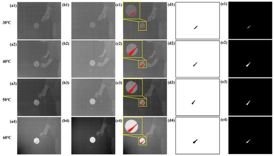 The detection results of SF6 gas in different background temperatures using the CBI system. (a1–a4) The images by the first filter (10,630 nm) in different background temperatures. (b1–b4) The images by the second filter (8370 nm) in different background temperatures. (c1–c4) The detection results in different background temperatures. (d1–d4) The ground-truth labels of SF6 gas in different background temperatures. (e1–e4) The measured labels of SF6 gas using our developed method in different background temperatures.