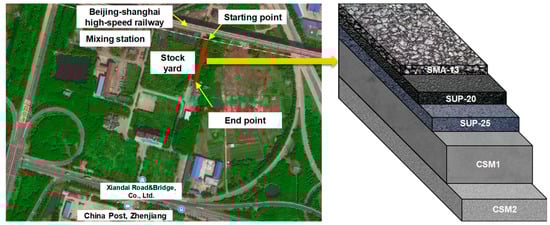 Based on the preliminary investigation and on-site investigation, to ensure the convenience of construction and the scale requirements of the APT site, the project is planned to be near a mixing station and a storage yard with the APT track parallel to the lane next to the storage yard in Zhenjiang, China. The south end of the test road section is connected to the cement hardening storage yard, and the north end is under the Beijing–Shanghai high-speed railway line, as presented in Figure 1.