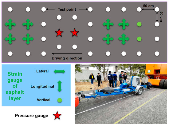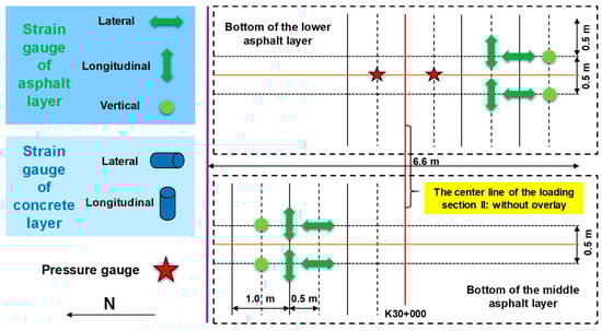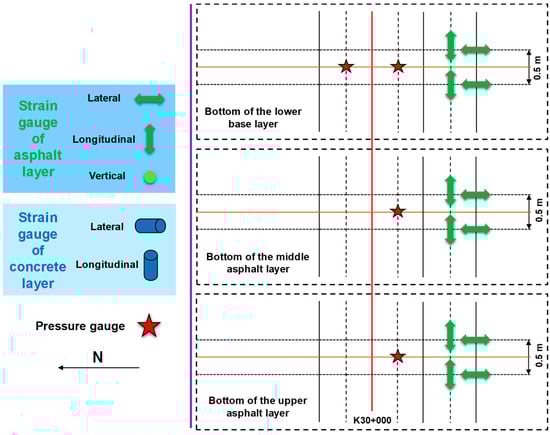 Figure 4 presents the arrangement of road sensors at the base layer from the top view. Four pressure gauges are buried in the bottom of the lower base layer; that is, the top surface of the subgrade base. The strain sensor comprises two lateral and two longitudinal sensors, and a group of strain sensors are buried in the upper and lower base layers and the subbase layer top; the sensor spacing is 50 cm.